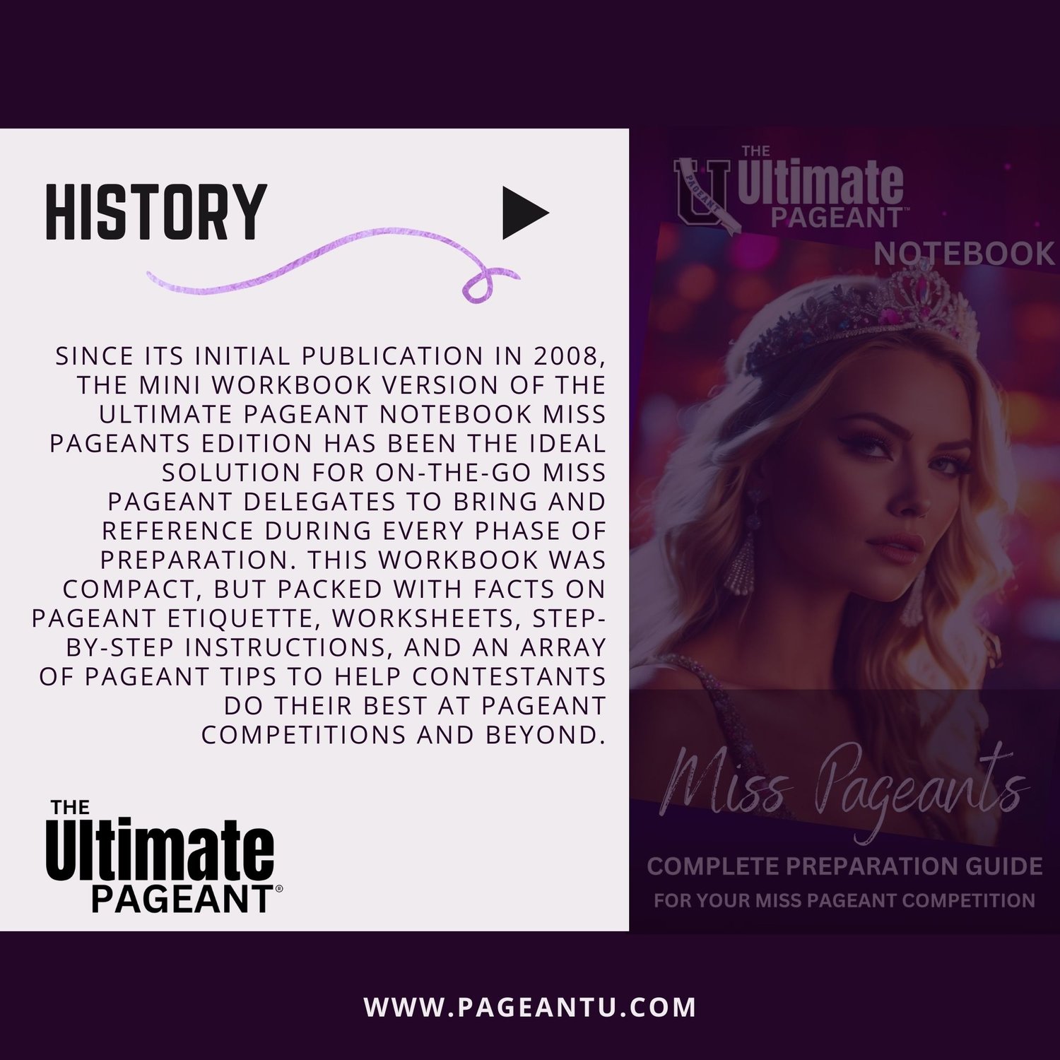 The Ultimate Pageant Notebook - Miss Pageants Edition is a complete pageant preparation workbook featuring a step-by-step outline of how to prepare for a pageant competition for young women. This downloadable e-book includes advice for navigating the world of pageantry, from what to bring, how to pack, creating a packing checklist, advice on your personal branding, marketing materials, hair and makeup advice, and everything you need to stand out from the competition.